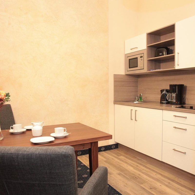 Our studio apartments are located on the ground floor and the third floor. They measure between 43 to 61 sqm. The spacious 2-room apartments have a separate living room and bedroom, and provide a balcony (except in apartment 1) with a view to the green inner courtyard.